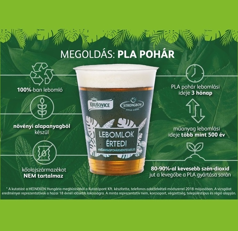 Ráadásul a PLA poharaknak az előállítása is jóval környezetkímélőbb, mint a klasszikus műanyagoké: a teljes gyártási ciklus során 80-90 százalékkal kevesebb széndioxid jut a levegőbe. Arról nem is beszélve, hogy megfelelő körülmények között mindössze három hónap alatt teljesen lebomlanak, míg ehhez a sztenderd műanyagpoharaknak 500 évre van szükségük. Éppen ezért, a PLA poharakat a cég szelektíven gyűjti és komposztálókba szállíttatja, hogy vagy visszakerüljenek a természetbe, vagy újra poharak készülhessenek belőlük. A kampány egyedülálló a HEINEKEN csoporton belül is, így van esély rá, hogy jó gyakorlatként más országokban is követőkre talál. A holland, ír, brazil és bolgár kollégák már jelezték is az érdeklődésüket.