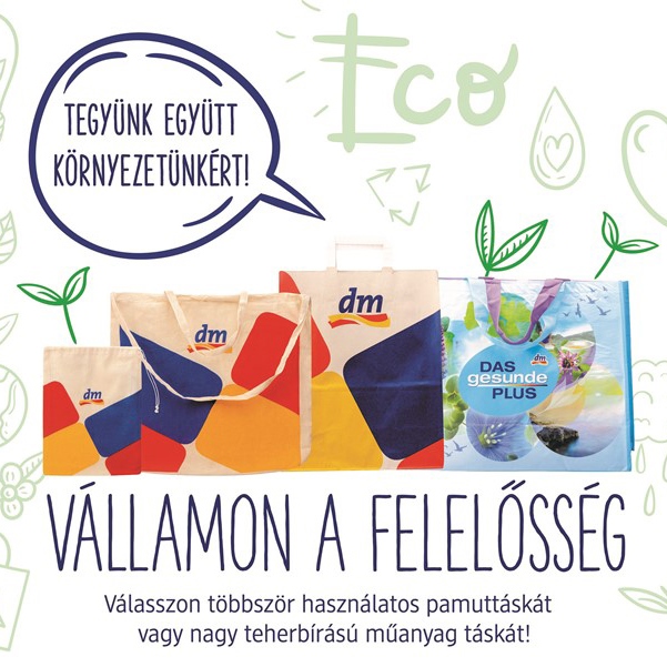 A vásárlók számára a dm igyekszik vonzóvá tenni a pamuttáskákat, az elhasználódott darabokat szimbolikus 1 forintért újra cserélik a boltban. Kedveltek az üzletekben a nagy teherbírású műanyag táskák, amelyekből kisebb és nagyobb változat is készül.